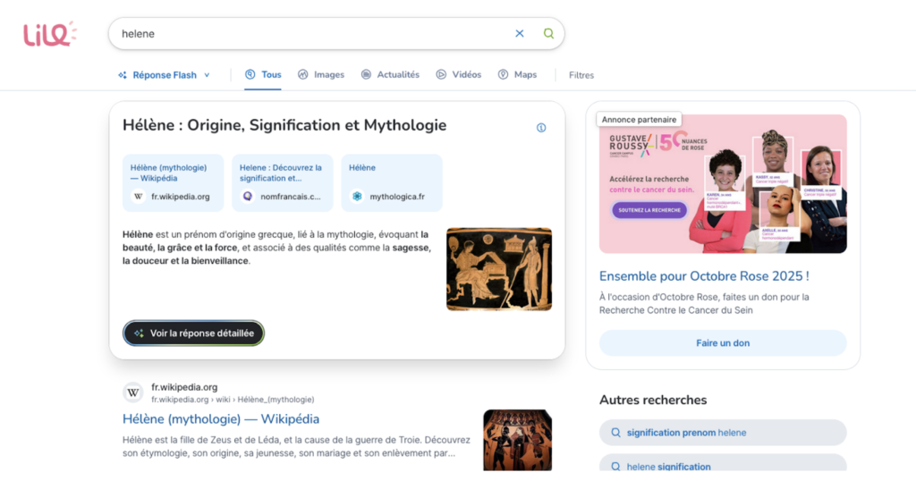 🔎 Faites une recherche comme d’habitude. Cliquez sur Réponse Flash pour obtenir une réponse synthétique. Vous pouvez approfondir cette réponse en cliquant sur « Voir la réponse détaillée ».